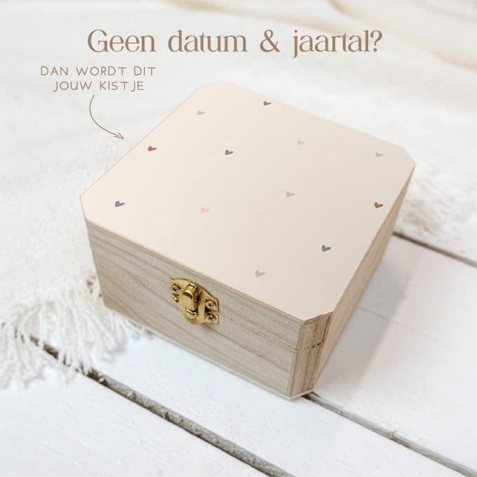 Op het kistje zelf kun je kiezen voor de uitgerekende datum of voor een ontwerp met alleen de kleine hartjes, zodat het kistje helemaal bij jullie wensen past. Het houten schijfje toont het grote nieuws en de echo – een intiem, persoonlijk en liefdevol gebaar dat iedereen raakt.