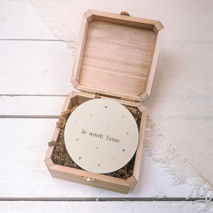 In het houten aankondigingskistje ligt een lief houten schijfje met de tekst “Jullie worden oom & tante”, “Je wordt oom” of “Je wordt tante”, precies zoals jij wilt. Zo wordt het moment direct persoonlijk, uniek en echt onvergetelijk. Wil je het nog magischer maken? Kies dan voor de variant met jullie eigen echo!