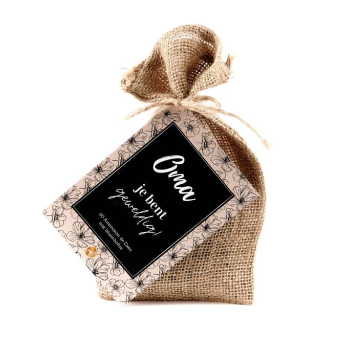 Ben je op zoek naar een origineel en duurzaam cadeau voor oma? Dan is dit jute zakje met 20 Anemonen de cean mix bloembollen en aardetablet een schot in de roos! Het is een cadeau dat niet alleen een glimlach op het gezicht van de ontvanger tovert, maar ook maandenlang plezier biedt.