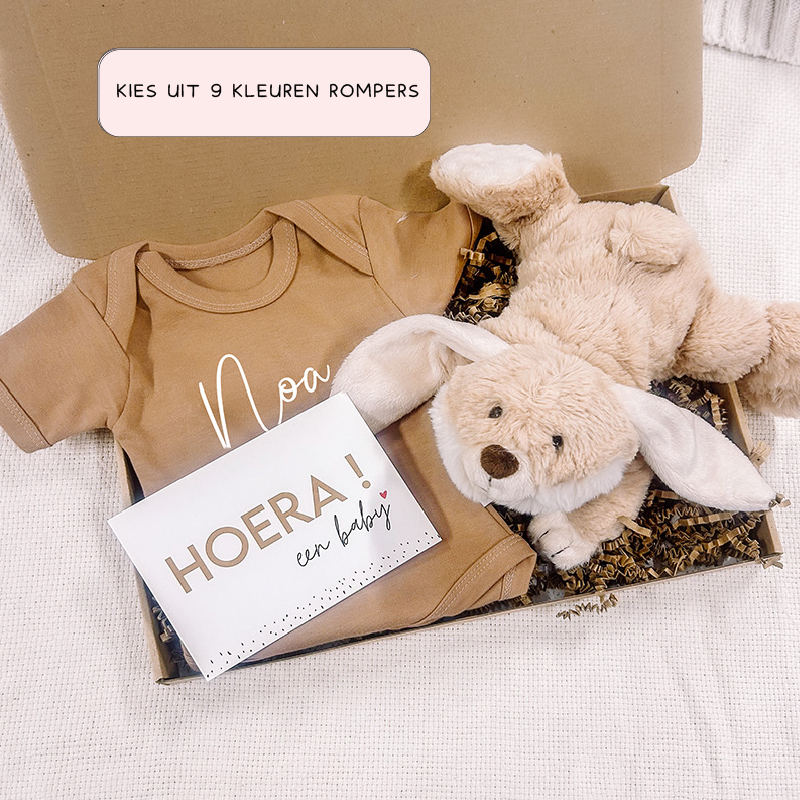 In dit pakketje vind je een schattig rompertje (jij kiest zelf uit 9 kleuren!) in maat 62/68, zodat de baby er niet direct uitgroeit. Daarbij zit een heerlijk zacht knuffel-konijntje – een knuffelvriendje waar ieder kindje blij van wordt!