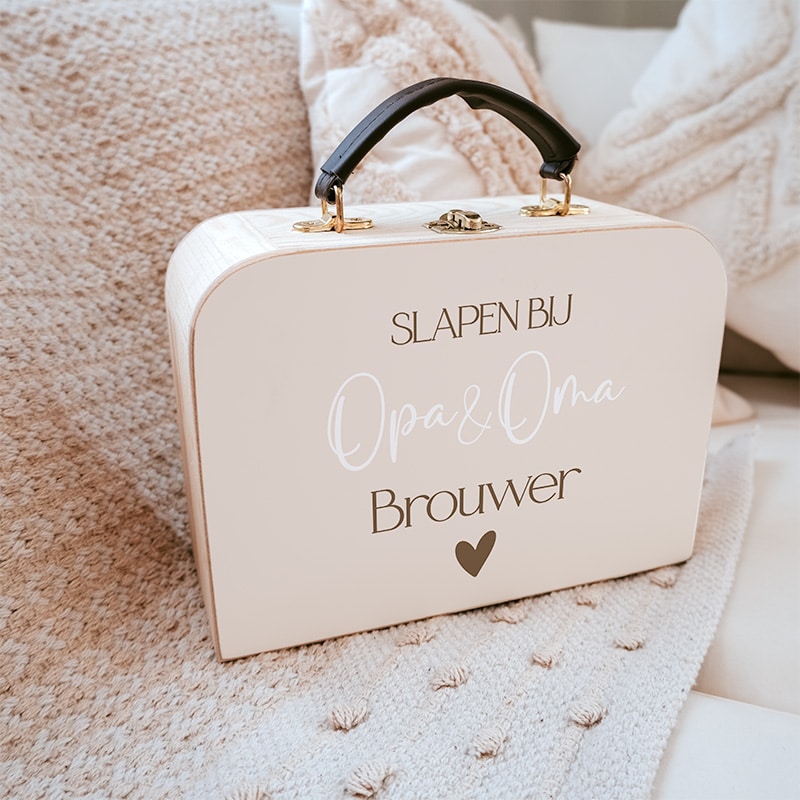 Ben je op zoek naar een bijzonder cadeau voor (aanstaande) opa en oma? Zet ze in het zonnetje met deze leuke cadeaubox speciaal voor opa’s en oma’s, maar dan in het groot! Deze XL box bevat onder andere een schattig logeerkoffertje van hout, een zacht ledikantlakentje met het motief “Hotel Opa & Oma” een leuke deurhanger voor aan de babykamer, de knuffel beer van Jollein én het populaire invulboek Opa, Oma & ik. Het koffertje en het invulboek is verkrijgbaar in 4 kleuren: blauw, roze, naturel en groen.