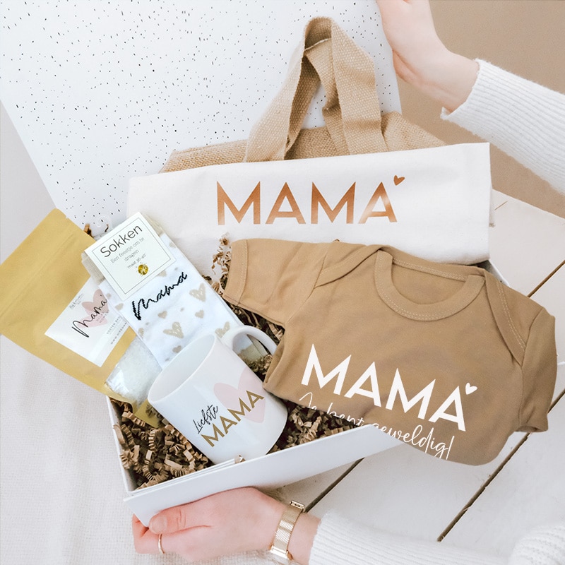 Verder vind je in deze cadeaubox de zachte Mama sokken en de populaire Luxe shopper bedrukt met MAMA in koperen letters. Alles bij elkaar een prachtig cadeau voor (de aanstaande) mama.
