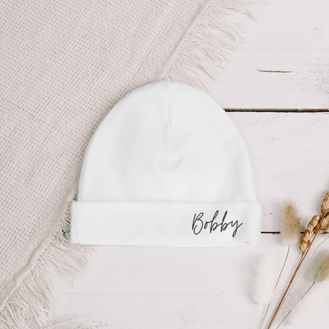 Met dit leuke babymutsje met naam zal de baby het niet koud krijgen! Altijd leuk om een cadeautje te personaliseren.