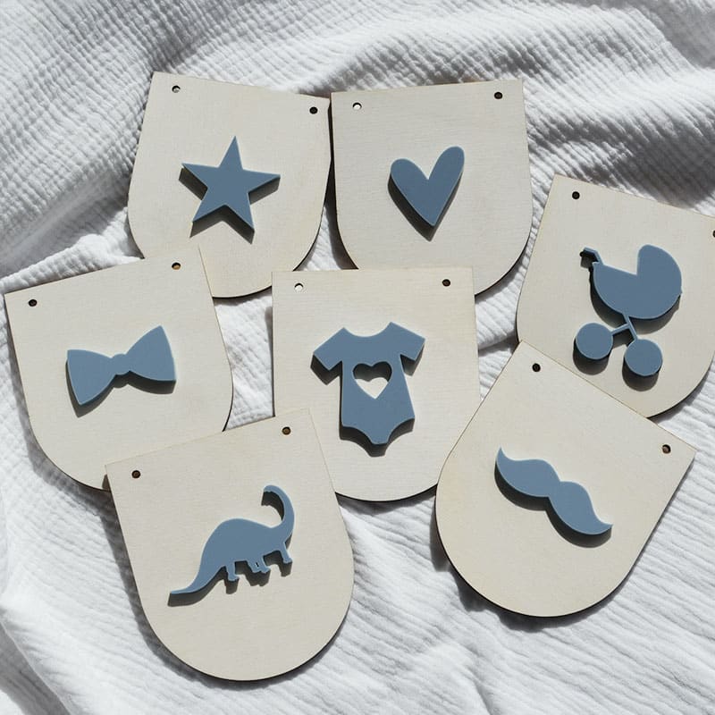 Met deze gepersonaliseerde houten vlaggetjes met blauw acryl geef je een stijlvol, persoonlijk en tijdloos kraamcadeau dat jarenlang gekoesterd wordt – altijd een cadeau dat in de smaak valt en direct klaar is om op te hangen.