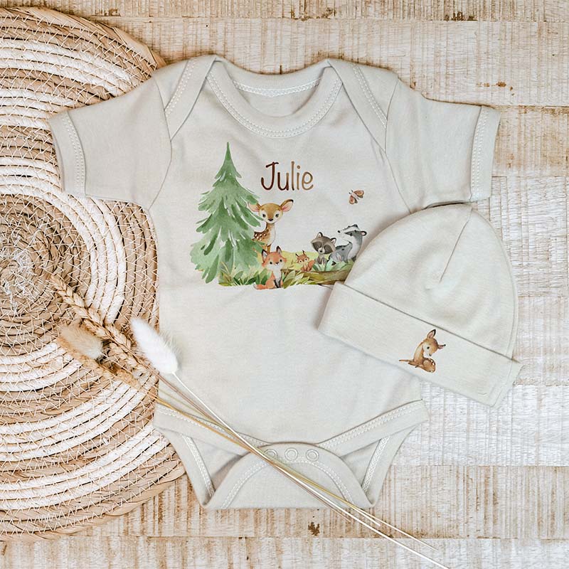 De opdruk komt het mooiste uit op een witte, roze, cream of zandkleurige romper. De natuurlijke tinten sluiten perfect aan bij het bosdieren-thema en zorgen voor een zachte, warme uitstraling.