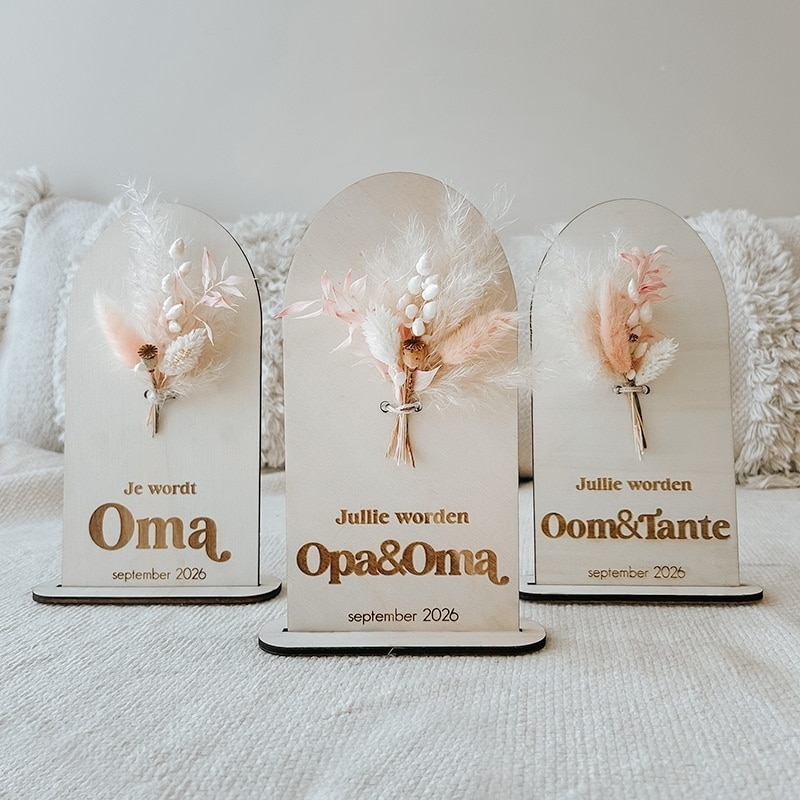 Wil je je zwangerschap op een unieke manier aankondigen? Onze houten zwangerschapsaankondiging met droogbloemen is de perfecte keuze! Dit gepersonaliseerde cadeau biedt een prachtige en betekenisvolle manier om het prachtige nieuws te delen met vrienden en familie.