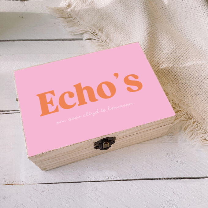 Houten Echo’s bewaarkist met Color Vibes-print in roze en oranje. A5-formaat bewaarkist om al je echo’s veilig en stijlvol te bewaren.