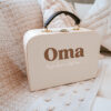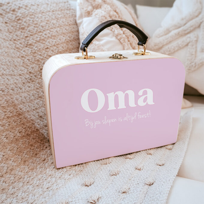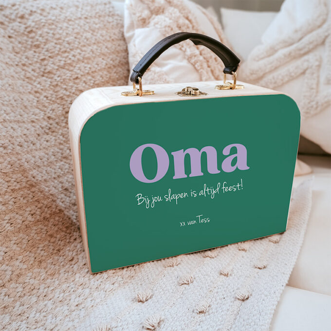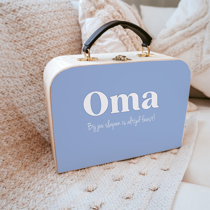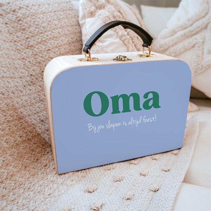 Het koffertje is stevig, heeft een natuurlijke houtlook en een liefdevolle opdruk. Zo wordt elk logeermoment bij oma nóg specialer. Verkrijgbaar met verschillende teksten, zodat er altijd een variant is die bij jullie past.