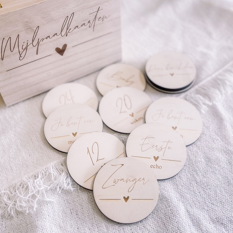 Van die eerste spannende weken tot het moment dat je buik écht begint te groeien — je zwangerschap is één groot avontuur vol herinneringen. Met deze houten mijlpaalschijven leg je elk bijzonder moment op een mooie, natuurlijke manier vast.