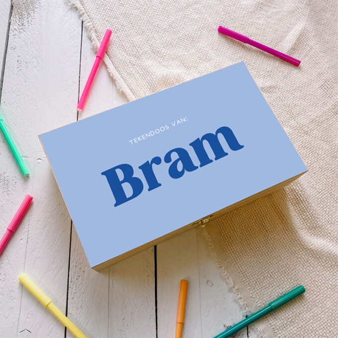 De naam staat prominent op de houten deksel, zodat ‘ie zijn spullen makkelijk terugvindt. Binnenin drie vakken om alles netjes te bewaren.