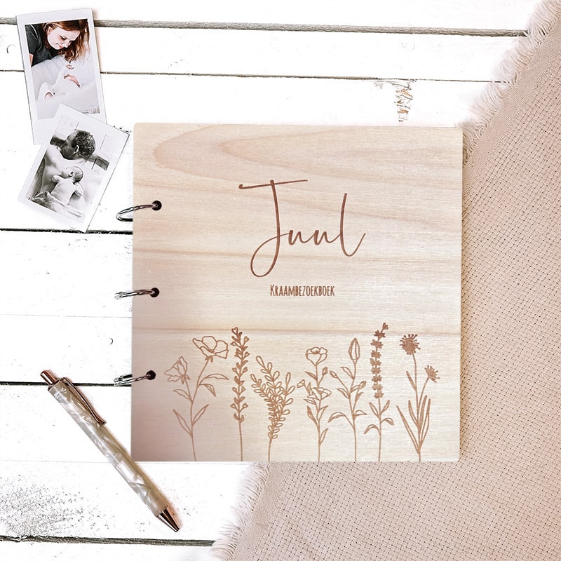 Elegant kraambezoekboek Flowers gegraveerd met gepersonaliseerde houten cover en ruimte voor lieve wensen en foto’s.