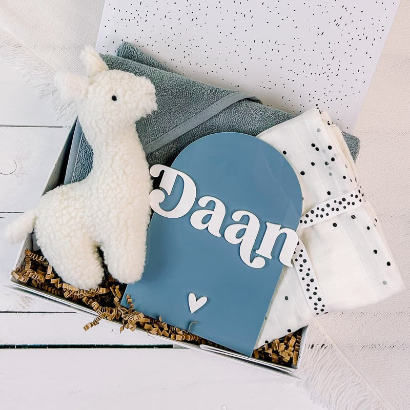 Deze box bestaat uit het super mooie geboortebordje van acryl, een fijne badcape, de knuffel lama van Jollein en een heerlijke hydrofiele doek van Done by Deer.