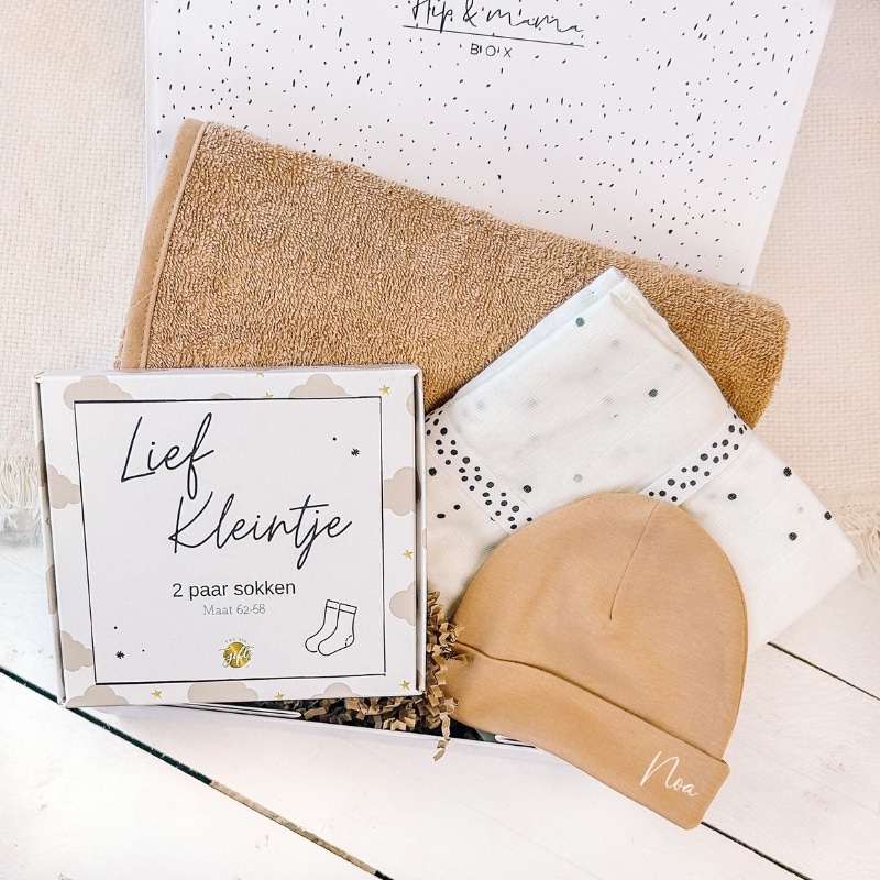 De Deluxe kraamcadeau box in de kleur zand is een geweldige verrassing! Deze box bevat een mutsje met naam, schattige baby sokjes (2 stuks), een zachte badcape en een mooie hydrofiele doek van Done by Deer. De luxe giftbox zelf is ook een stijlvolle bewaarbox voor waardevolle herinneringen én kun je ook personaliseren met naam. Voeg een gratis persoonlijk kaartje toe en je hebt een prachtig cadeau dat zeker goed in de smaak zal vallen!
