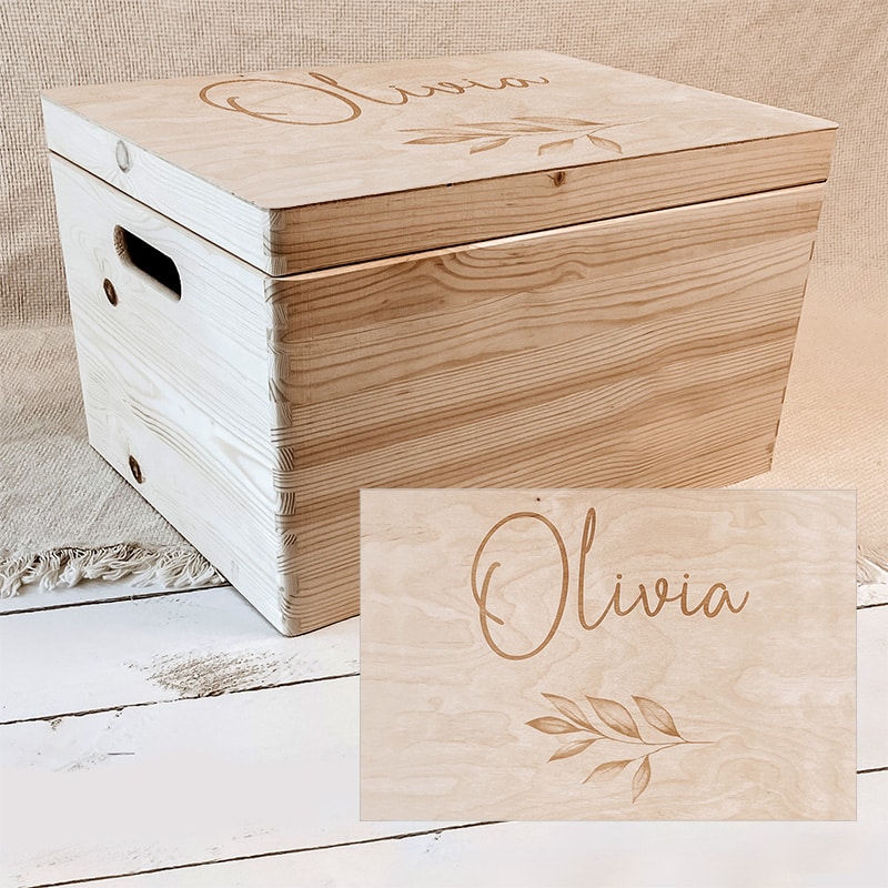 De Memorybox Olivia is een prachtige houten bewaarbox, gegraveerd met de naam van jouw kindje. Een persoonlijke plek om alles te verzamelen wat je niet wilt kwijt raken: van de eerste schattige sokjes tot tekeningen, echofoto’s en kleine spulletjes die zo dierbaar zijn.