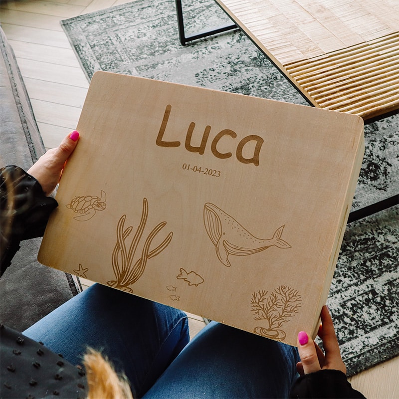 Stijlvolle houten memorybox met gegraveerde zeedieren. Past perfect in een oceaan thema kinderkamer!