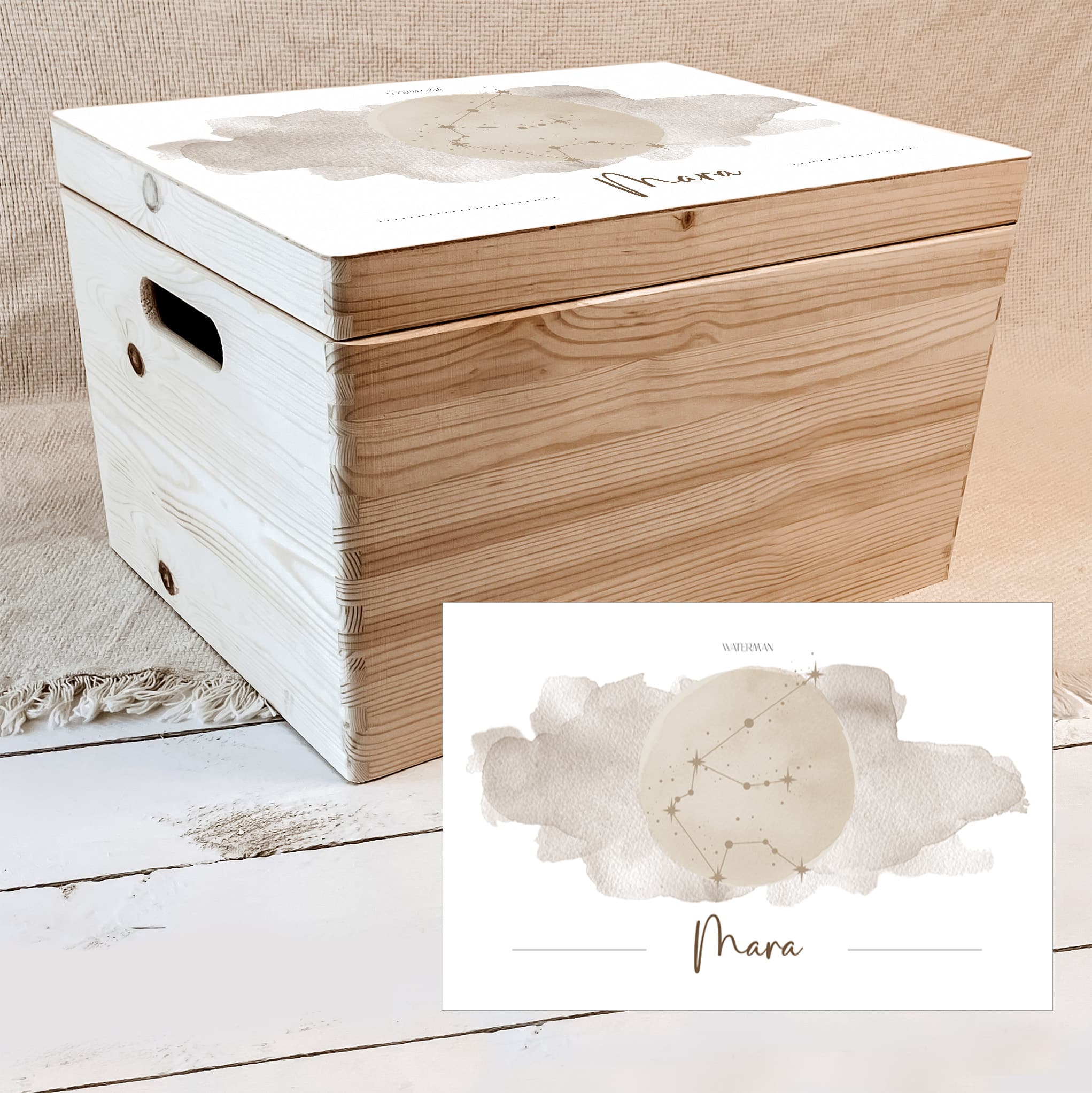 Zacht wit met beige en zijn of haar sterrenbeeld: deze memorybox is een liefdevol plekje voor alles wat je wilt bewaren van de eerste jaren. Een prachtig aandenken én een uniek cadeau voor kersverse ouders.
