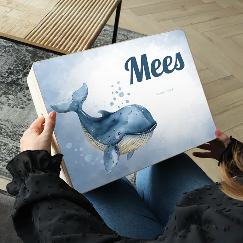 Het ontwerp is stoer en lief tegelijk, met een vrolijk walvisje en keuze uit blauwe of roze naamopdruk. De memorybox staat niet alleen prachtig in de babykamer, maar is ook superhandig om tastbare herinneringen overzichtelijk te bewaren.