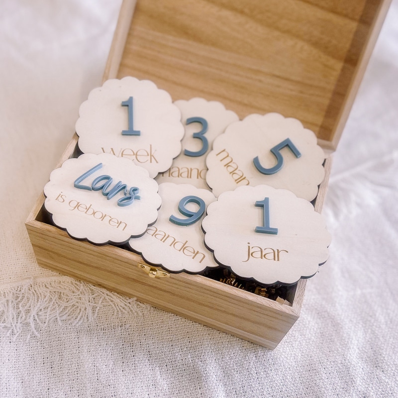 Leg alle bijzondere momenten van het eerste jaar vast met deze set van 14 houten mijlpaalschijven. Superlief voor foto’s van je kleintje en een prachtig kraamcadeau.