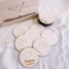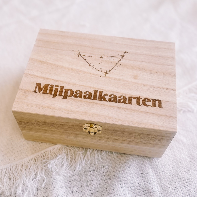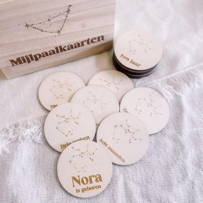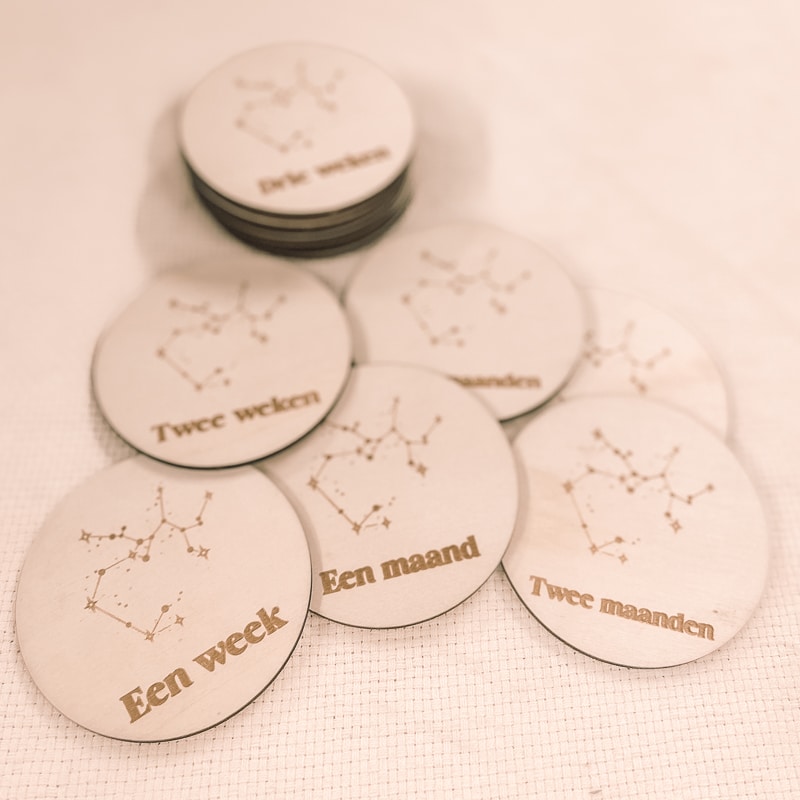 Het subtiele sterrenbeeld-ontwerp maakt de schijven tijdloos en passend bij ieder interieur. Gebruik ze bij fotoshoots of als maandelijkse herinnering: zo leg je de groei van je baby op een unieke manier vast. Een dierbaar aandenken voor later en een origineel kraamcadeau.