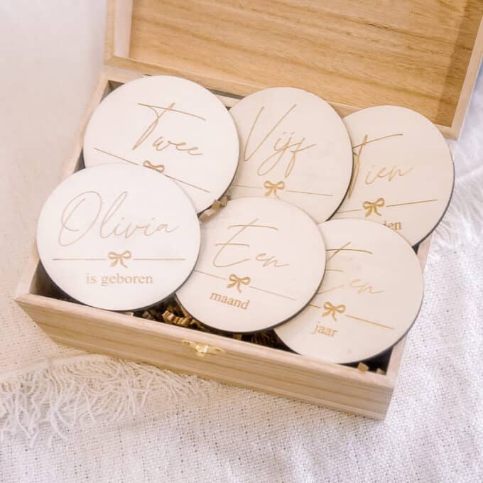 Leg alle bijzondere momenten van het eerste jaar vast met deze set van 14 houten mijlpaalschijven – een prachtig aandenken én superleuk voor foto’s van je kleintje.