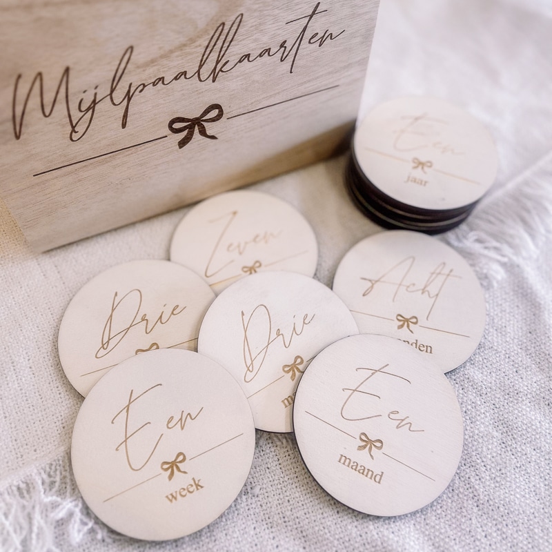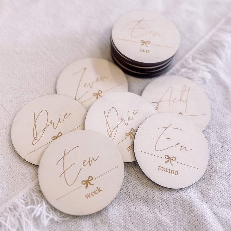 Leg alle bijzondere momenten van het eerste jaar vast met deze set van 14 houten mijlpaalschijven – een prachtig aandenken én superleuk voor foto’s van je kleintje.