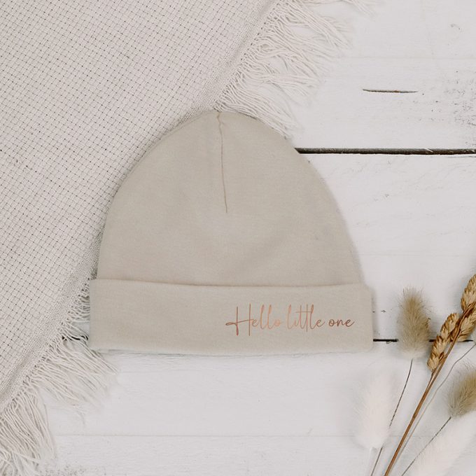 Dit zachte baby mutsje met de tekst “Hello Little One” in de kleuren wit, cream en sand is een tijdloos en liefdevol item voor de allerkleinsten. De neutrale tinten passen bij alles en maken het een fijn eerste kledingstuk voor het nieuwe leven dat eraan komt.
