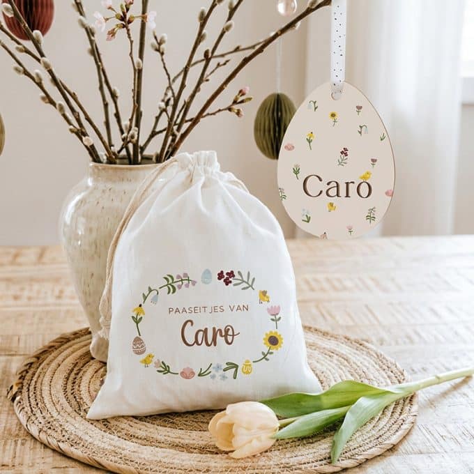Een zonnige lentedag, kinderen die lachen en rondrennen met hun eigen zakje vol paaseitjes – dit paaszakje met naam | Bloemetjes maakt het extra bijzonder. Perfect om te geven als klein cadeau of gewoon voor een vrolijk Pasen in huis.