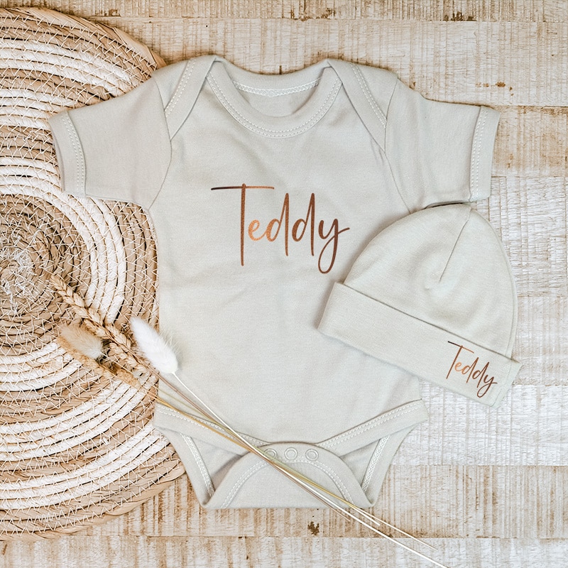 Dit zachte en stijlvolle setje van romper en muts in een warme creamkleur is helemaal gepersonaliseerd met de naam van de baby in koperkleur.