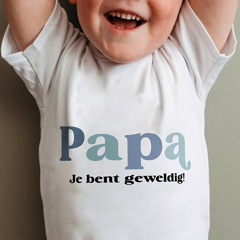 Verras papa met dit lieve shirtje en laat hem weten hoe geweldig hij is! Een hartverwarmend cadeau waarmee je kindje papa zeker laat glimlachen, perfect voor Vaderdag of een andere speciale gelegenheid. Gemaakt van zachte kwaliteit, wasbaar op 30 graden. Let op: niet geschikt voor de droger en de opdruk niet strijken. Ontdek ook onze uitgebreide Vaderdagcollectie voor opa’s én papa’s – met volop personaliseerbare cadeaus.