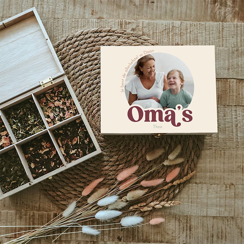 Voor oma’s mooiste theemomentjes. Haar favoriete thee netjes opgeborgen, een foto én een lieve boodschap met de namen van haar kleinkinderen.