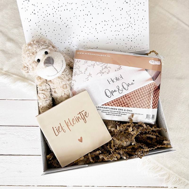 In de box vind je een paar zorgvuldig gekozen items die meteen een glimlach oproepen. Een tegeltje met de tekst ‘Lief kleintje’ voor een mooi plekje in huis, een ledikantlaken met ‘Hotel Opa & Oma’ voor het bedje waar straks geslapen wordt, en een zachte knuffel die alvast mag wachten op logeerpartijtjes bij opa en oma.