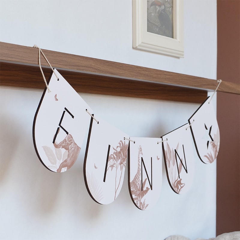 Geef een stijlvol en natuurlijk kraamcadeau met deze vlaggenlijn met naam Jungle Party Sepia. De uitgesneden letters in hout maken de naam van de baby duidelijk en speels zichtbaar. Het sepia-design zorgt voor een zachte, warme jungle-uitstraling die in iedere kamer past.