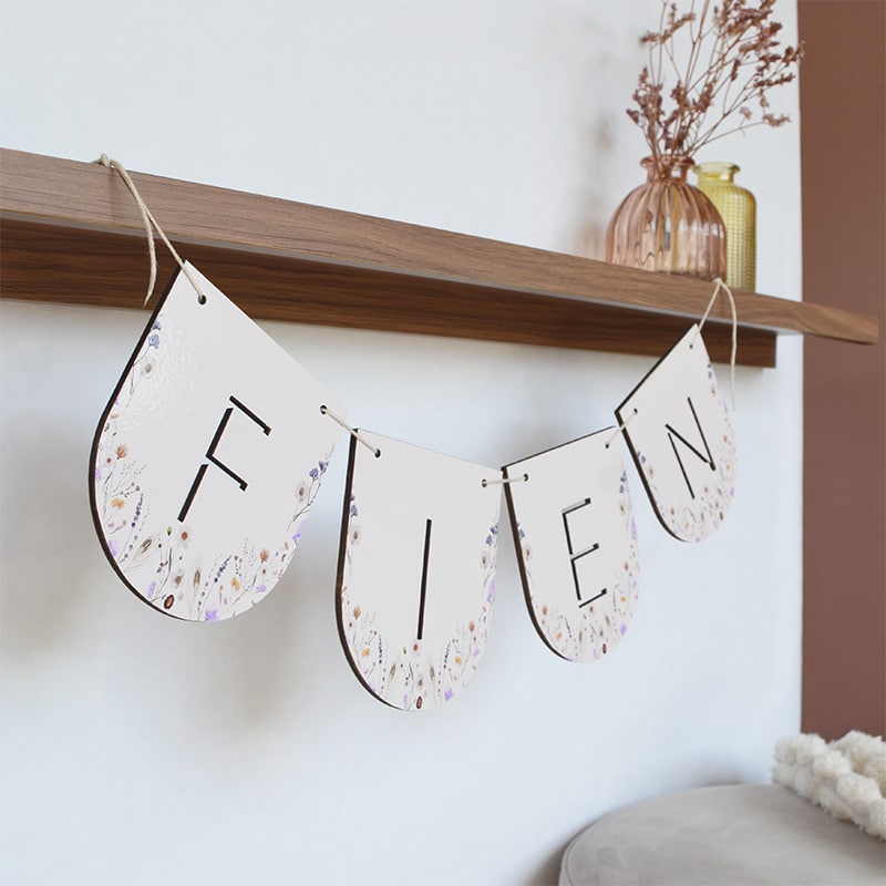 Verras kersverse ouders met een bijzonder en persoonlijk kraamcadeau: de vlaggenlijn met naam Spring Flowers. Elke letter is zorgvuldig uit hout gesneden. Het vrolijke bloemenontwerp geeft een frisse en speelse uitstraling die prachtig past in elke meisjeskamer.
