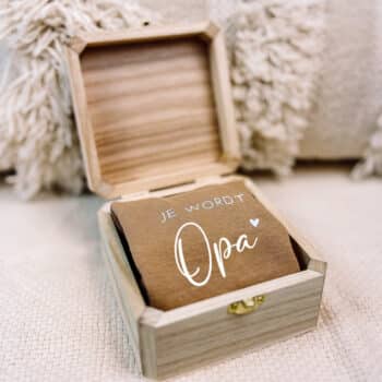 Ben je op zoek naar een zwangerschapsaankondiging voor Opa en Oma en wil je zien wat er nog meer verkrijgbaar is? Bekijk dan alles hier in de shop. Zo kun je kiezen voor een romper, typerend voor een baby op komst. Of juist een aankondigingskistje, dat is altijd een goed idee! Waar opa & oma het kistje openen en verrast zullen worden met het prachtige nieuws dat op het schijfje gegraveerd staat. Beide is super leuk?